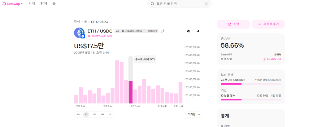 위 사진은 1위 DEX 유니스왑 캡쳐입니다. ETH/USDC 풀에 유저는 ETH, USDC 2개의 토큰을 공급하여 ETH/USDC 페어를 거래하는 사람들의 수수료를 받아 수익을 낼 수 있습니다. 따라서 페어 즉 2개의 토큰을 1:1의 가치로 공급하는게 일반적입니다.